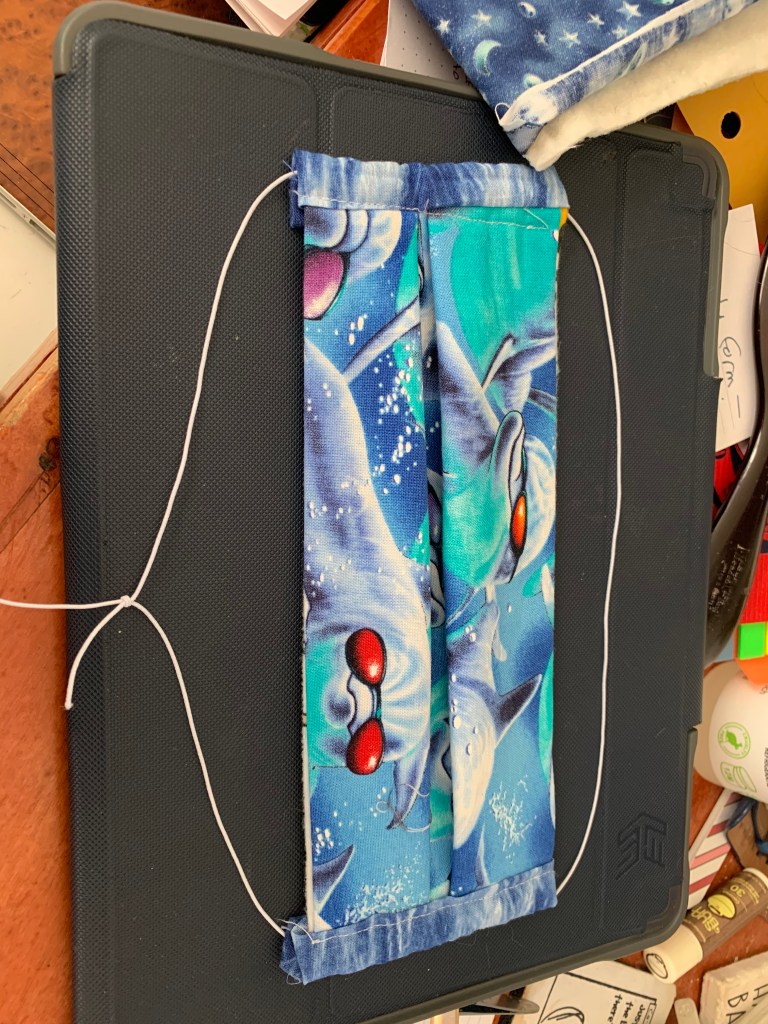 I’ve also opted to string the masks with thin elastic that you can wear over your head rather than just your ears, because I think it makes the masks much more comfortable to wear for long periods. You can do that with many patterns- just extend the elastic so it is one big circle- extended at least the length of the mask on both sides and through the sides without pulling. This is usually about right- you can always shorten the elastic up if you need it tighter by adding a knot in the elastic. -picture below