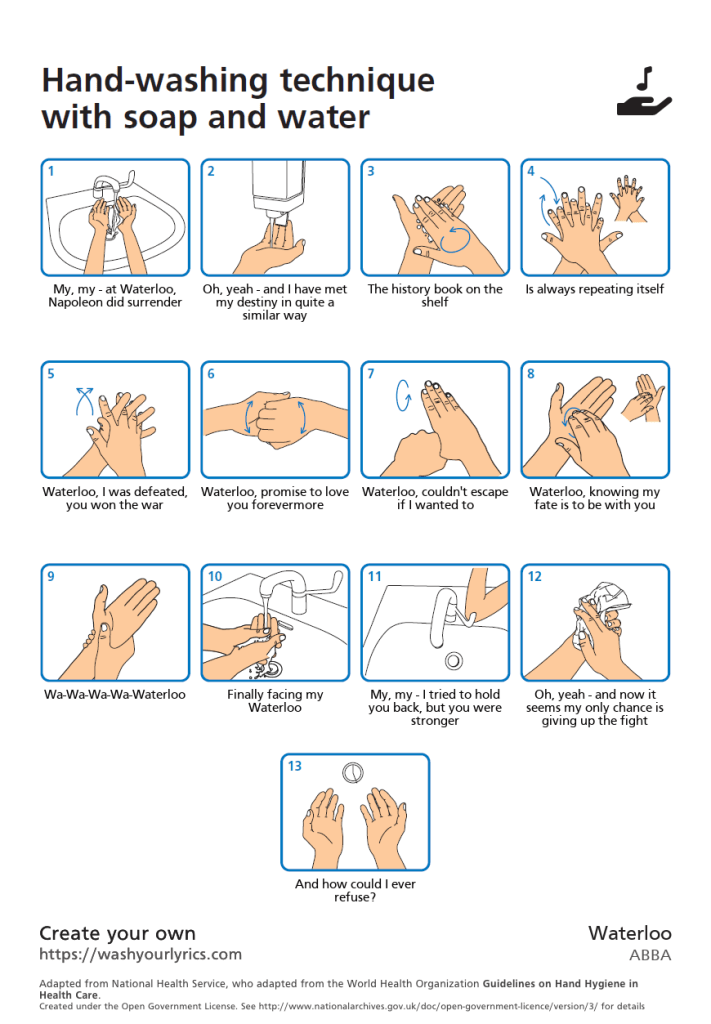 If you’re tired of signing happy birthday twice while washing you hands, you can go to Wash Your Lyrics, put in the name of a song and the artist, and get a printable poster to go along with handwashing. The one below? Abba’s Waterloo.