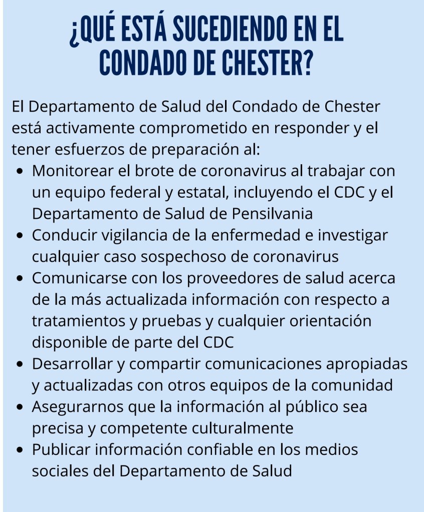 La información en esta página es de la Agencia de Manejo de Emergencias del Condado de Chester.